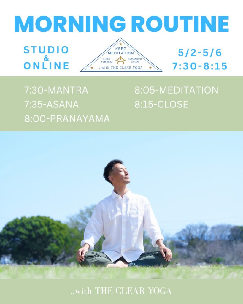 【日時】 5/2. 5/3. 5/4. 5/5. 5/6 7:00-8:00【場所】 @with_the_clear_yoga 又は オンライン【講師】吉本憲太郎 @kentarouyoshimoto【参加】スタジオチケット1回分 / 単発 ¥3,000オンラインチケット 1回分 / 単発 ¥1,500