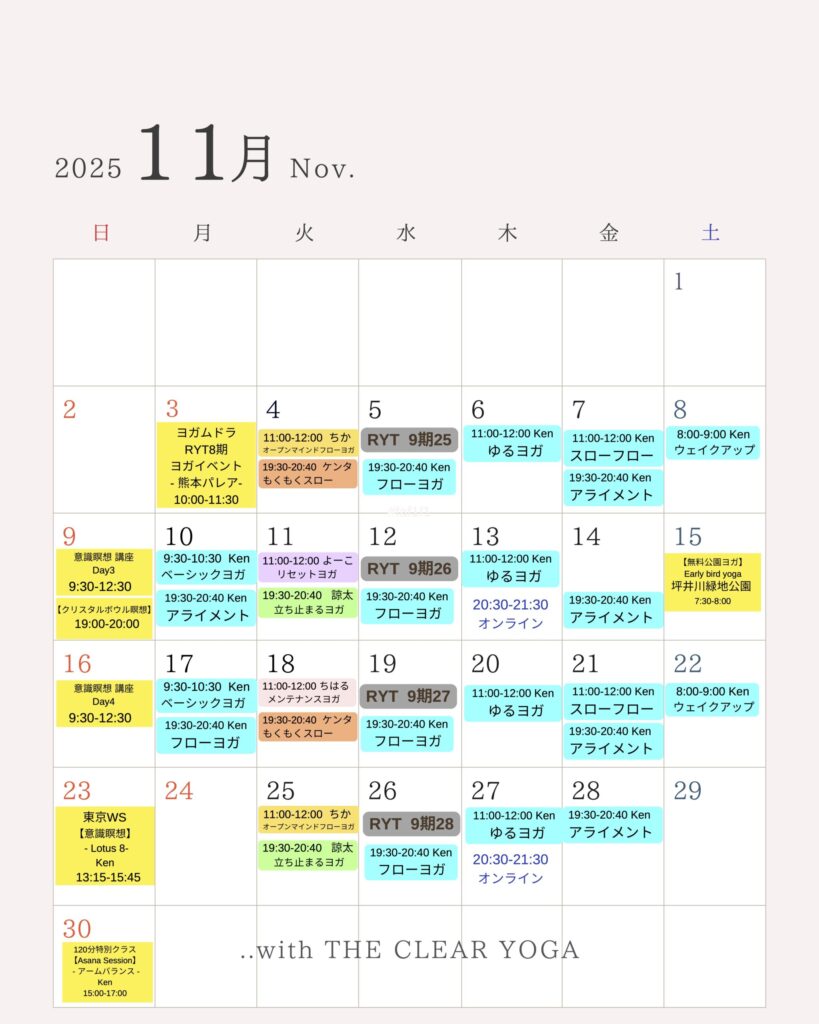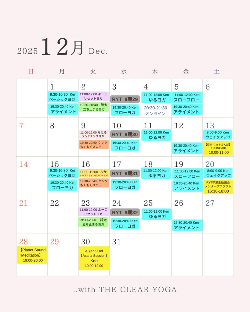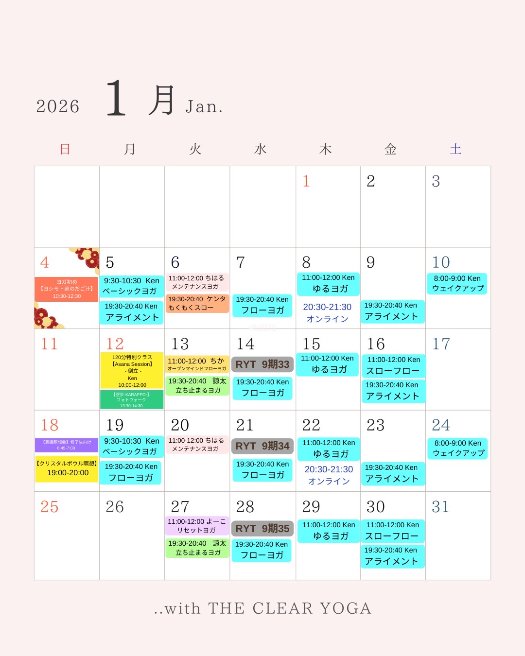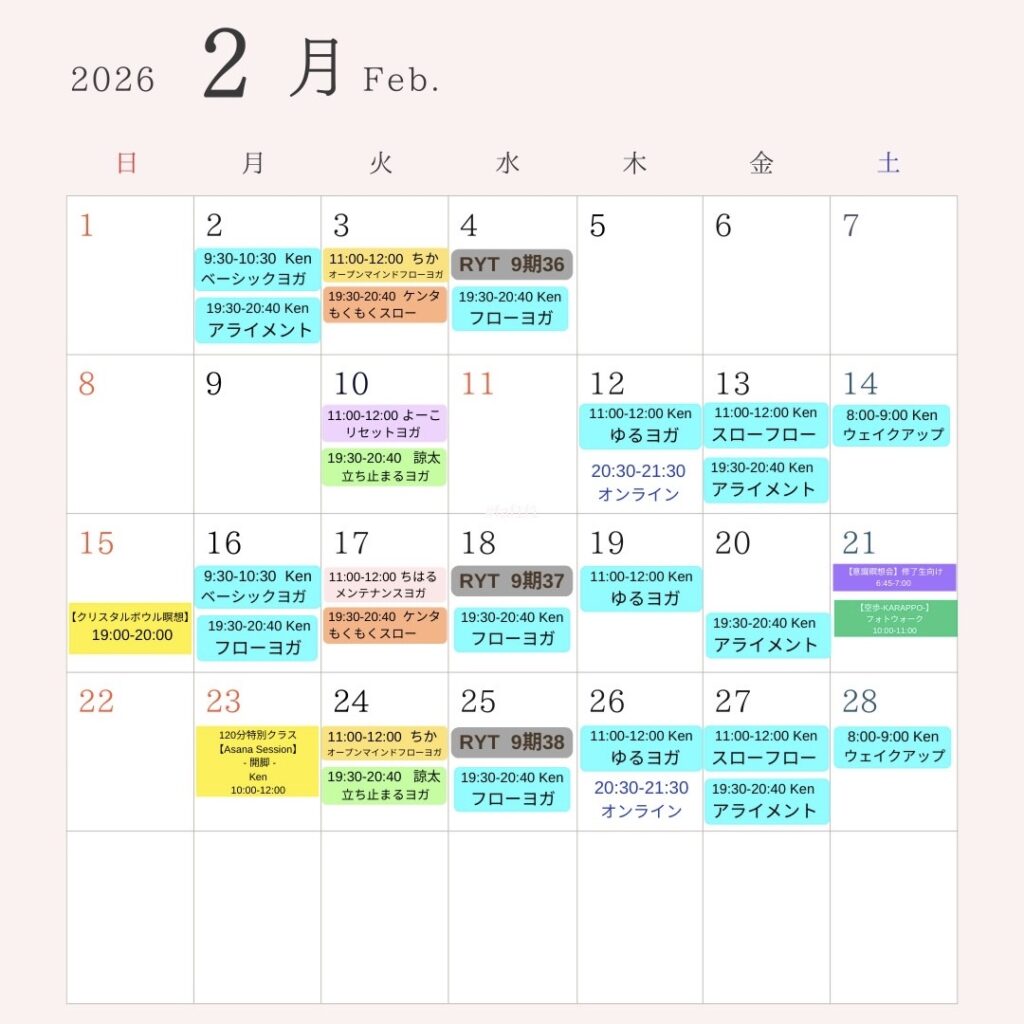 Class ご予約・お問い合わせは 公式LINE よりお待ちしています スタジオ会員入会金 ¥5,000 体験レッスン・ドロップインは不要 スタジオチケットご購入の方対象 お支払い:現金・PayPay・銀行振込・クレジットカード お申し込み スタジオドロップイン(単発) ¥3,000 入会金不要 持ち物:ヨガマット・水分・タオル・動きやすい服装 ヨガマットレンタル ¥300 お支払い:当日現金またはPayPay お申し込み スタジオ5回チケット ¥11,000 有効期限:初回ご利用より3ヶ月 持ち物:ヨガマット・水分・タオル・動きやすい服装 ヨガマットレンタル ¥300 お支払い:現金・PayPay・銀行振込・クレジットカード お申し込み オンライン5回チケット ¥5,500 有効期限なし 隔週木曜日 20:30〜21:30(60分) お支払い:現金・PayPay・銀行振込・クレジットカード お申し込み オンラインドロップイン(単発) ¥1,500 隔週木曜日 20:30〜21:30(60分) お支払い:現金・PayPay・銀行振込・クレジットカード お申し込み プライベートレッスン体験 ¥8,000 通常料金 ¥11,000 (90分) / おひとり様 プライベートレッスン 90分 お支払い:現金・PayPay・銀行振込・クレジットカード お申し込み プライベートレッスン詳細へ ベーシック 60分運動量 : ★☆☆初心者の方がヨガに親しめるようなクラスです。ヨガの中でもやさしいポーズを中心に 、一つひとつゆっくり丁寧に行います。基本的な身体の使い方や呼吸法などを身に付けることができます。 アライメント 70分運動量 : ★★☆「ハタヨガ」の基本のポーズと呼吸法をバランス良く行い、しっかり全身を動かしていきます。体の配置を整えながら一つひとつのポーズを丁寧に行い、ご自身と向き合う感覚を養います。 フロー 70分運動量 : ★★★呼吸を連動させながら、流れるようにポーズからポーズへ動いていきます。全身を心地よく動かし、体内のエネルギーが循環が高まり免疫力アップの効果が期待できます。 ウェイクアップヨガ 60分運動量 : ★☆☆朝のヨガで、スッキリした気分で一日を過ごすことができます。新鮮な空気を取り込み、身体も頭もクリアに目覚めさせ集中力アップや仕事の効率が期待できます。 ゆるヨガ 60分運動量 : ★☆☆股関節周りを中心にゆっくり動いていきます。下肢のリンパや血流が流すことで全身が軽くなり午後の活動がイキイキと過ごせます。 スローフロー 60分運動量 : ★★☆やさしいポーズを流れるように繰り返し行います。午前中に身体を動かすことで、スッキリした一日を過ごせます。 オンラインクラス 60分zoomアプリを使用します。事前のインストールをお願いします。ID、パスコードはご予約後にお知らせします。 【ご連絡・注意事項】 ご予約はLINE@ または メール よりお願いします。ご予約は準備のため、クラス開始3時間前までにお願いします。スタジオチケット有効期限3ヶ月は厳守でお願いします。クラス開始1時間前のキャンセルはポイント消化となりますのでお気をつけ下さい。スタジオ入室は15分前からお願いします。クラス中は心身ともに無理のない範囲で行ってください。 所持品・貴重品はご自身での管理をお願いします。万が一の紛失・盗難の場合、補償は致しかねますのでご了承ください(必要以上の貴重品の持ち込みはお控えください) *皆さまに、安心かつ安全にヨガを楽しんで頂きたく、何卒ご協力のほどよろしくお願いいたします! Instagram Facebook